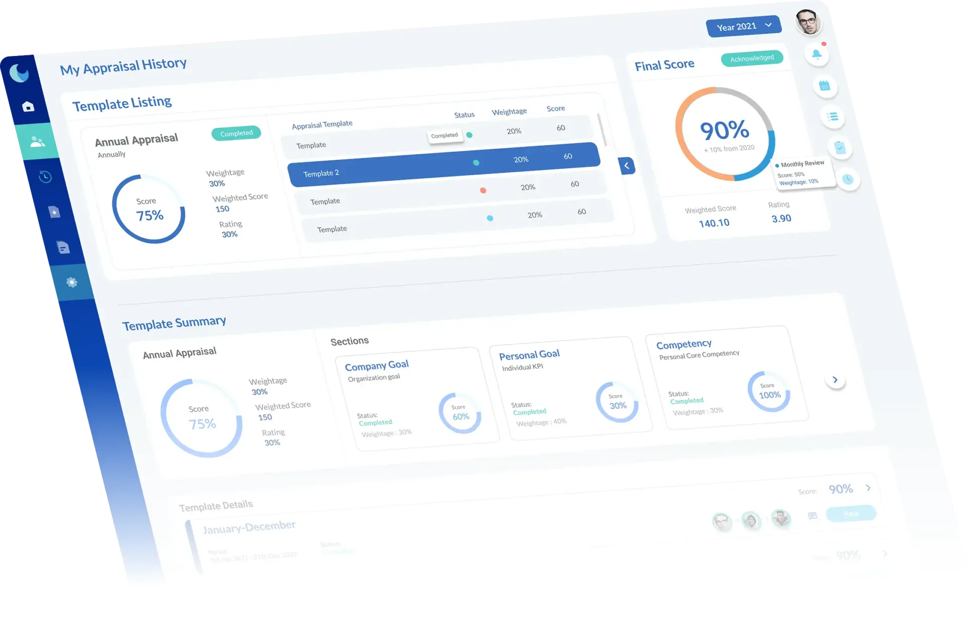 Custom appraisal templates with 360-feedback and goal tracking. Generate performance reports for actionable reward and recognition.